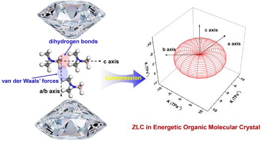 零线性压缩材料可用作抗冲击材料,在高达数十吉帕的高压冲击环境中保持稳定。发现具有零线性压缩特性的含能材料,并阐明其构效关系,将极大地满足含能材料日益增长的高稳定性、高安全性需求。然而,目前仅发现包含超硬材料、特殊骨架材料两类共十余种具有零压缩行为的材料,含能有机材料的零压缩行为研究仍属空白。针对这一问题,肖冠军教授及合作者以富氢化合物TMAB为研究对象,结合高压同步辐射X射线衍射、高压单晶衍射、拉曼、红外、吸收光谱以及第一性原理计算,系统地研究了TMAB的高压结构演变,证明了TMAB在9.2 GPa发生了等结构相变,确定了在9.2至14.0 GPa压力范围内TMAB的零线性压缩行为,填补了有机材料零压缩研究的空白,并提出双氢键协同作用是TMAB零压缩行为的关键。本研究发现了具有零线性压缩行为的富氢有机分子晶体材料,建立了双氢键与富氢材料结构演化行为之间的联系,为抗冲击推进剂的设计提供了新思路。
