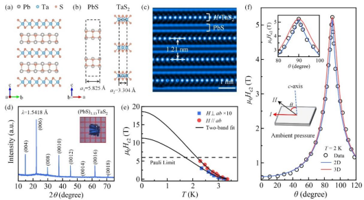 1. 常压下(PbS)1.13TaS2呈现典型的失配层状结构,其超导各向异性比γ = μ0H//ab c2(0)/μ0Hab c2(0) = 16.9,且角分辨的上临界场μ0Hc2符合2D Tinkham模型,表明超导转变具有显著的2D特征。
