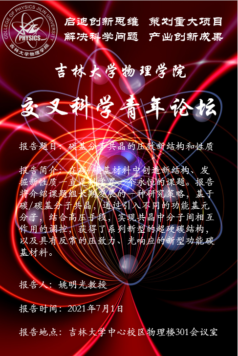 在碳/碳基材料中创造新结构、发掘新性质一直是科学界一个永恒的课题。报告将介绍课题组长期发展的一种研究策略,基于碳/碳基分子共晶,通过引入不同的功能基元分子,结合高压手段,实现共晶中分子间相互作用的调控,获得了系列新型的超硬碳结构,以及具有反常的压致力、光响应的新型功能碳基材料。