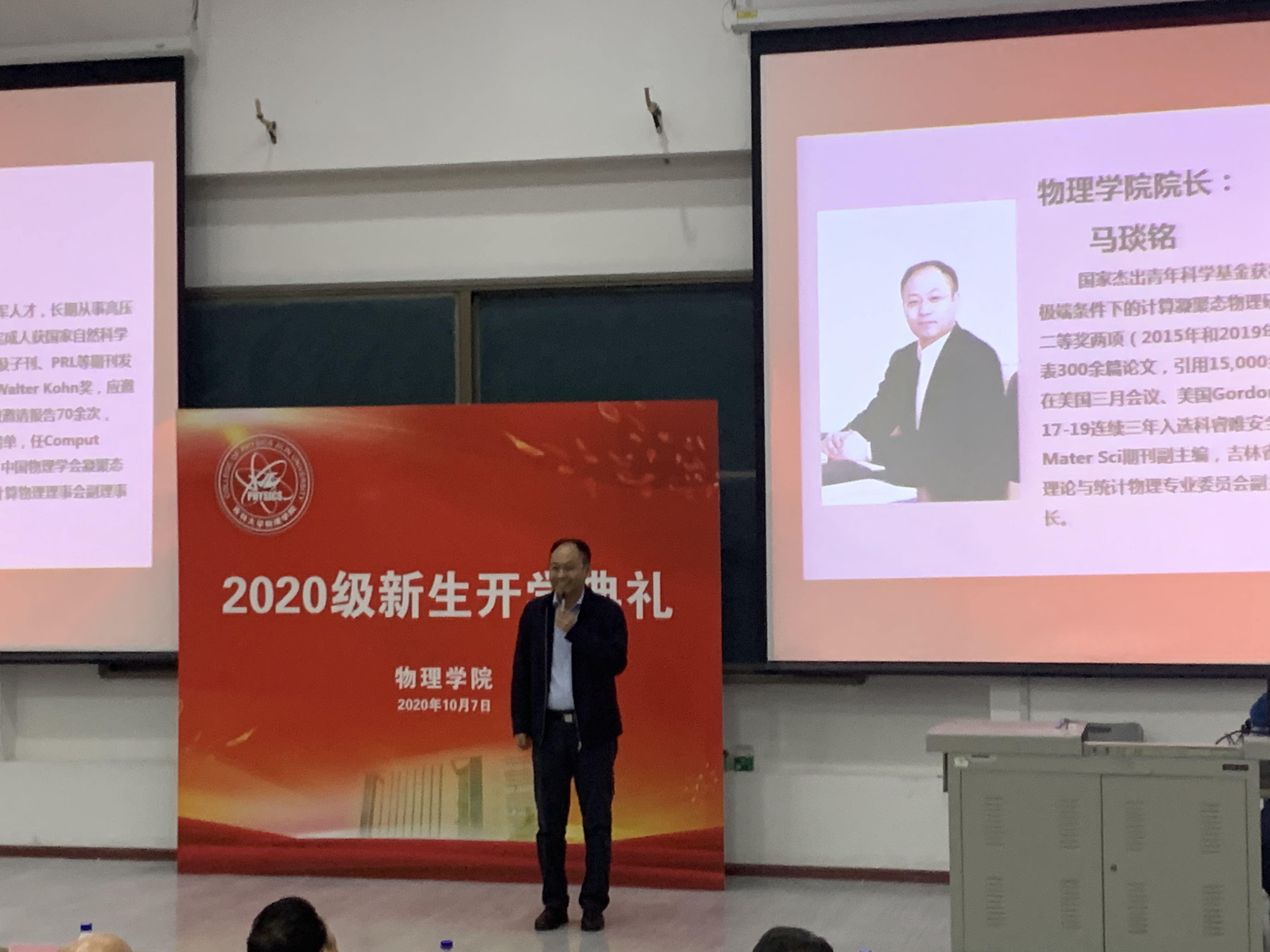对2020级新生的到来表示热烈欢迎,并以自身经历为例,勉励同学们学会自主学习、独立生活、直面困难,用行动践行坚忍不拔,追求卓越的吉大物理精神。他希望同学们以“求实创新、励志图强”的校训为指引,在未来的学习生活中发挥物理脚踏实地的优良作风,努力成为勤学善思,博学多识的新时期大学生。他叮嘱同学们要常怀感恩之心,感恩父母对我们的养育之恩;感恩老师对我们的谆谆教诲;感恩国家繁荣昌盛,为祖国和民族复兴而努力奋斗。