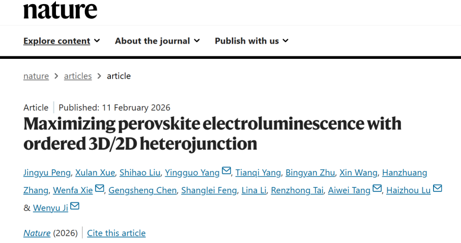 谢文法教授、刘士浩副教授、复旦大学杨迎国教授、东南大学卢海洲教授及北京交通大学唐爱伟教授等研究团队,在钙钛矿电致发光器件(PeLED)发光界面调控及器件效率方面取得突破进展。研究团队通过“一步法”原位构建三维/二维(3D/2D)有序异质结钙钛矿薄膜的新策略,成功将绿光PeLED的外量子效率(EQE)提升至42.9%(经第三方认证为42.3%),刷新了该类器件的世界纪录。相关成果以《Maximizing perovskite electroluminescence with ordered 3D/2D heterojunction》为题发表于国际顶级期刊《Nature》。