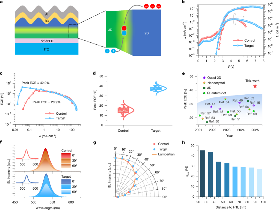 图2 钙钛矿发光二极管的器件性能。(a) 3D/2D钙钛矿异质结的PeLED结构示意图。参考器件与目标器件的 (b) 电流密度‒电压‒亮度曲线,及 (c) 外量子效率(EQE)−电流密度曲线。(d) 参考器件与目标器件的峰值EQE分布(各15组)。参考器件和目标器件的平均EQE分别为15.2%(相对标准偏差为21%)和37.5%(相对标准偏差为6%)。(e) 已报道的绿色PeLED与本工作中器件的峰值EQE汇总对比。(f) 参考与目标器件在不同观测角度下的电致发光(EL)光谱,插图为归一化的EL光谱。不同角度下器件发光的一致性。(g) 参考器件、目标器件以及标准朗伯体模型的EL角度分布。(h) 基于时域有限差分法模拟的偶极子源(即激子形成区域)的光提取效率随其与空穴传输层距离的变化关系。(图源:Nature)